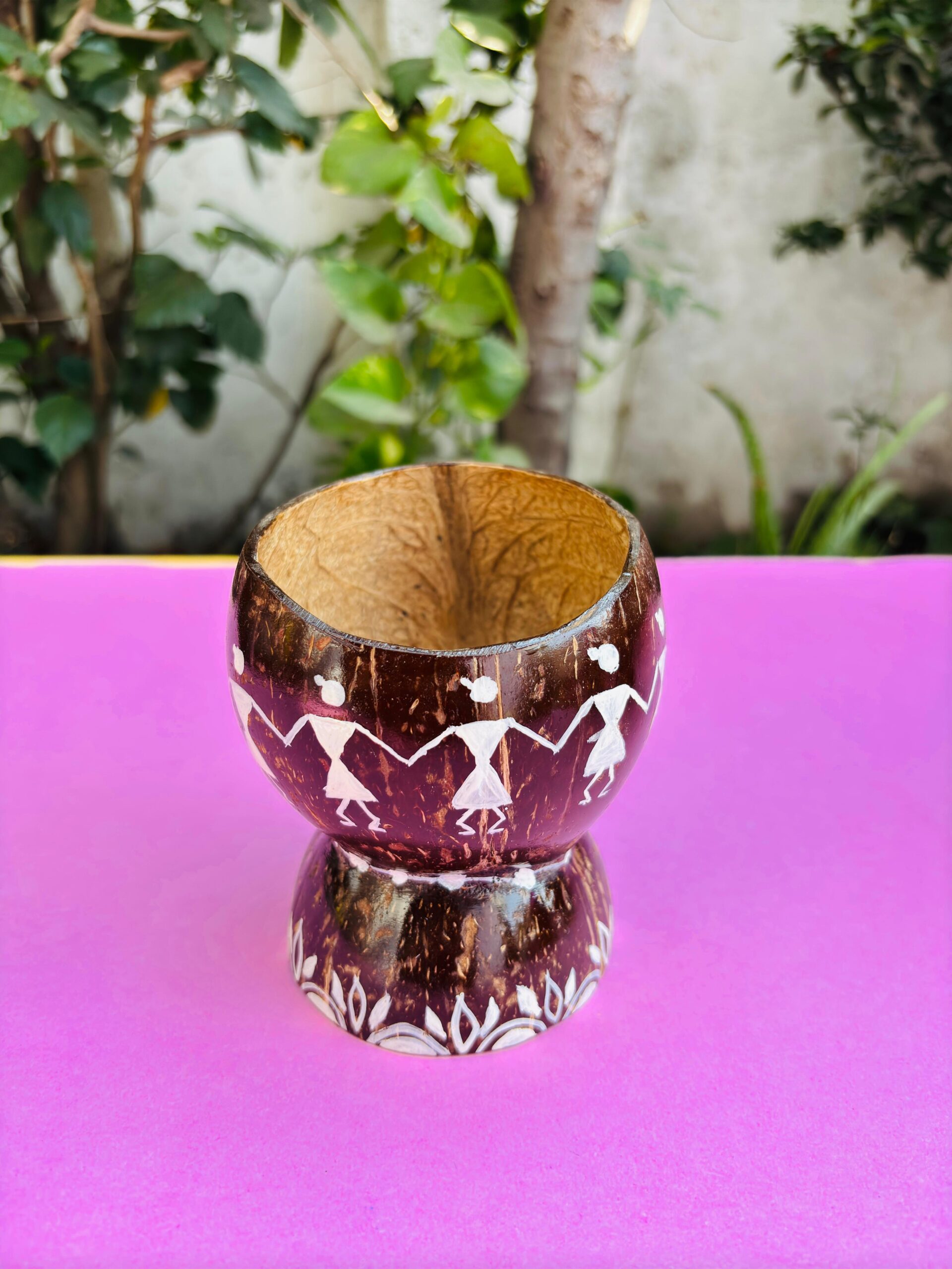 A stylish coconut shell planter featuring Warli art, ideal for adding a tribal charm to your home while nurturing your plants.
