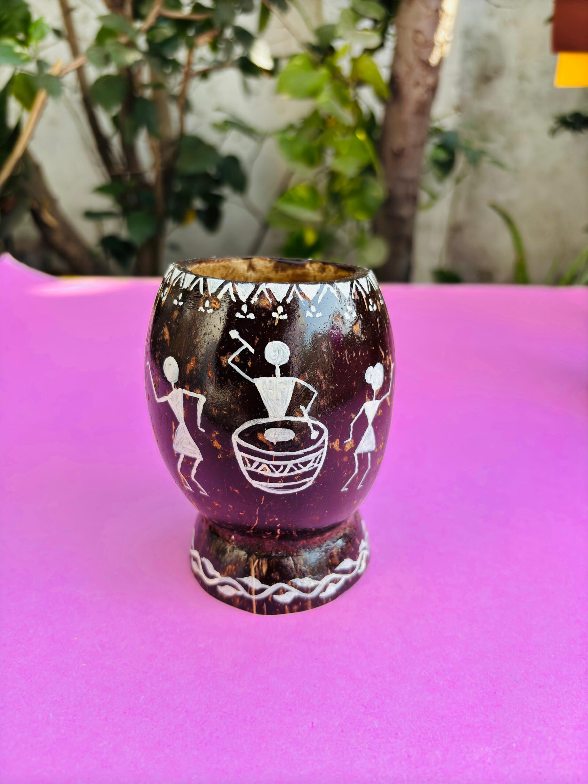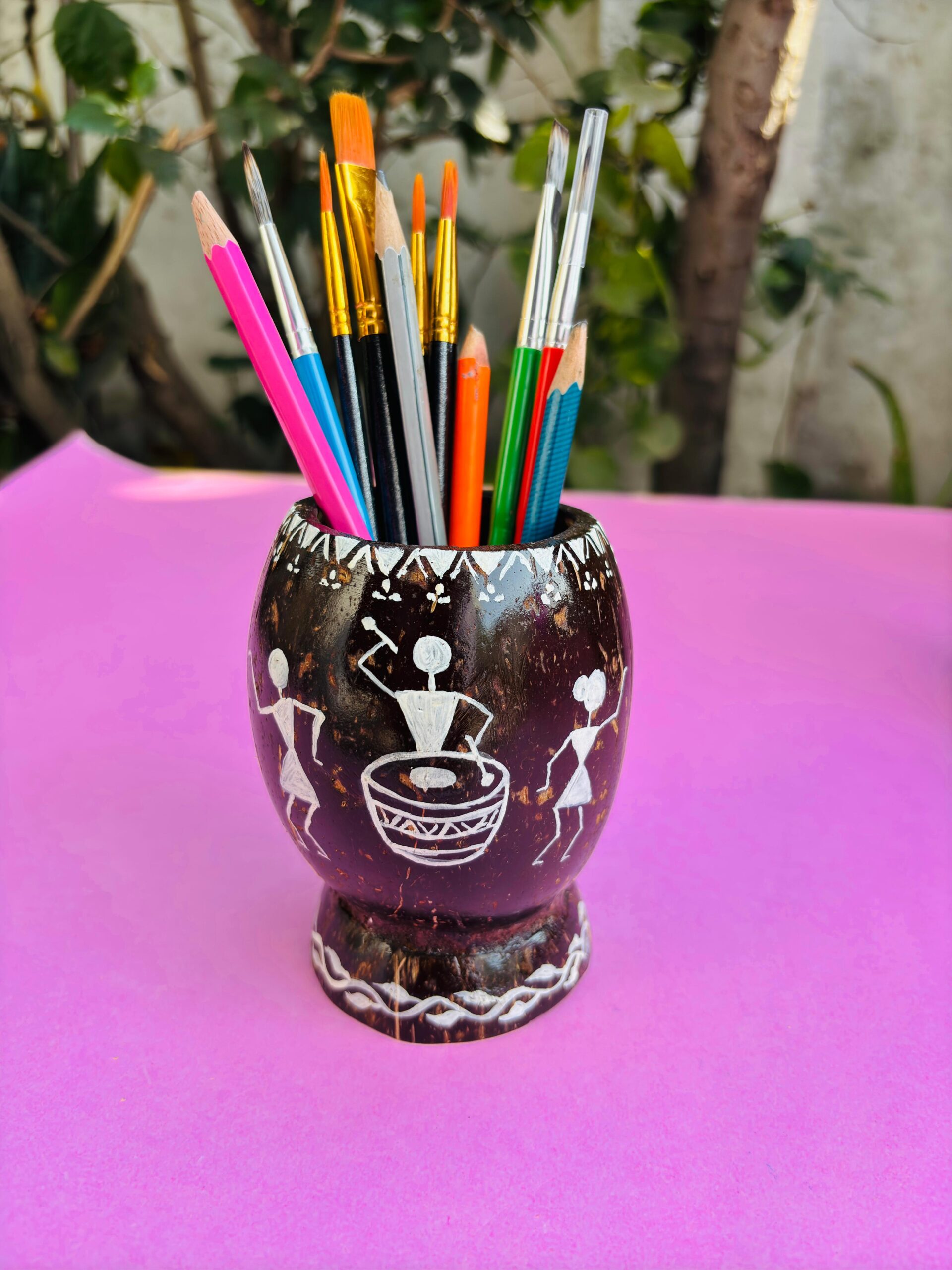 This exquisite pen stand is made from natural coconut shell, offering a sustainable and eco-friendly design. Painted with traditional Warli art, a form of tribal art from India, it adds a touch of heritage and artistry to your office or home decor. The perfect blend of functionality and culture, this pen stand is ideal for organizing pens, pencils, and other small items while enhancing the aesthetic appeal of any space. A perfect gift for those who appreciate handcrafted, ethnic designs.